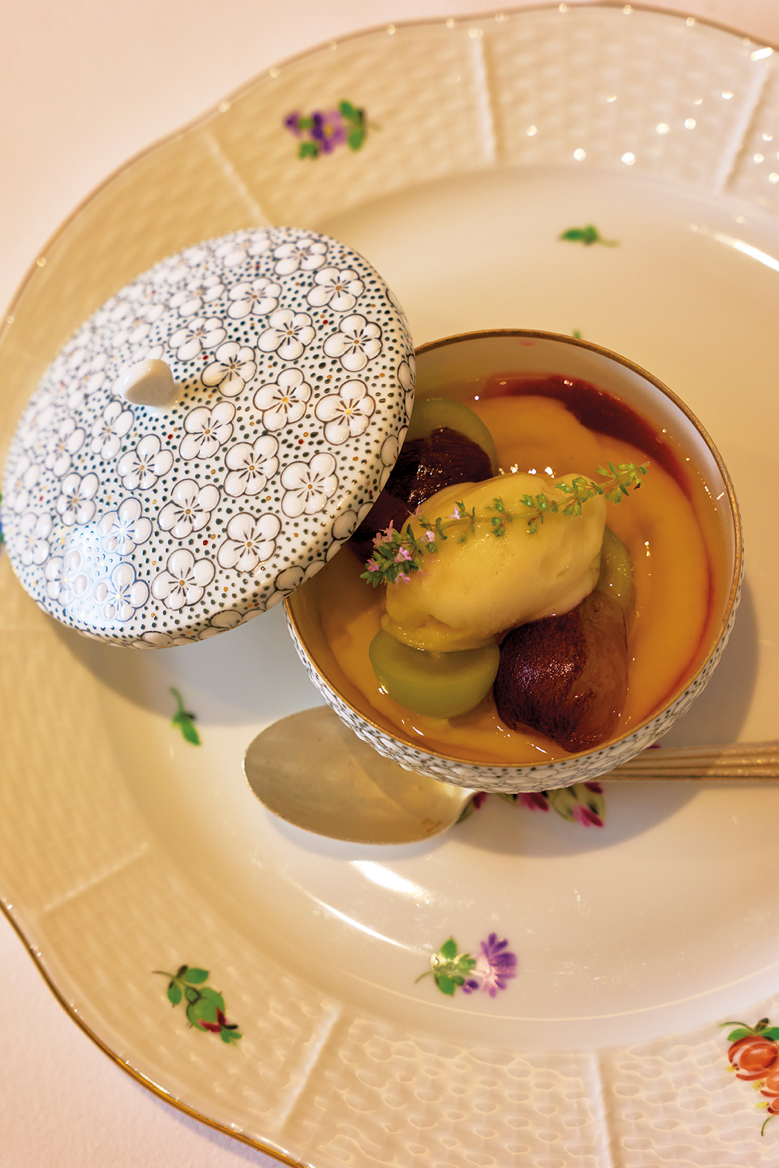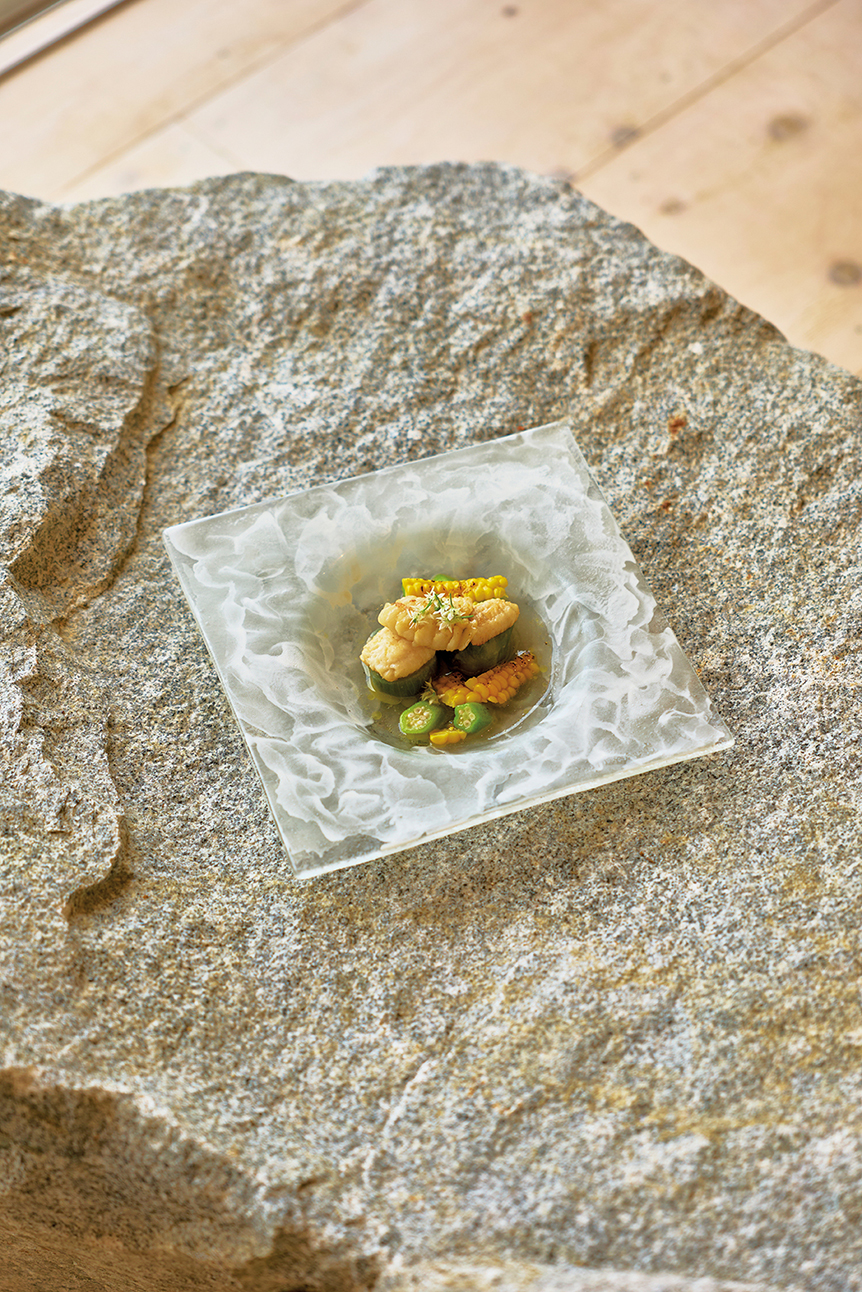 디저트까지 총 여덟 번 디시가 바뀌는 화려한 코스 요리가 시작되자 김기남·이진곤 셰프의 눈이 더 반짝거렸다. 인근 바다에서 잡은 오징어와 직접 농사지은 버섯으로 만든 리소토, 생햄과 자두를 올린 핑거 푸드, 밭에서 수확한 호박에 리큐어가 들어간 차가운 수프, 직접 사냥한 멧돼지고기 수프로 만든 쿠스쿠스가 담긴 애피타이저 세트를 시작으로 모리시게 셰프가 미식을 통해 전하려는 이야기가 식탁 위로 선명하게 펼쳐졌다.