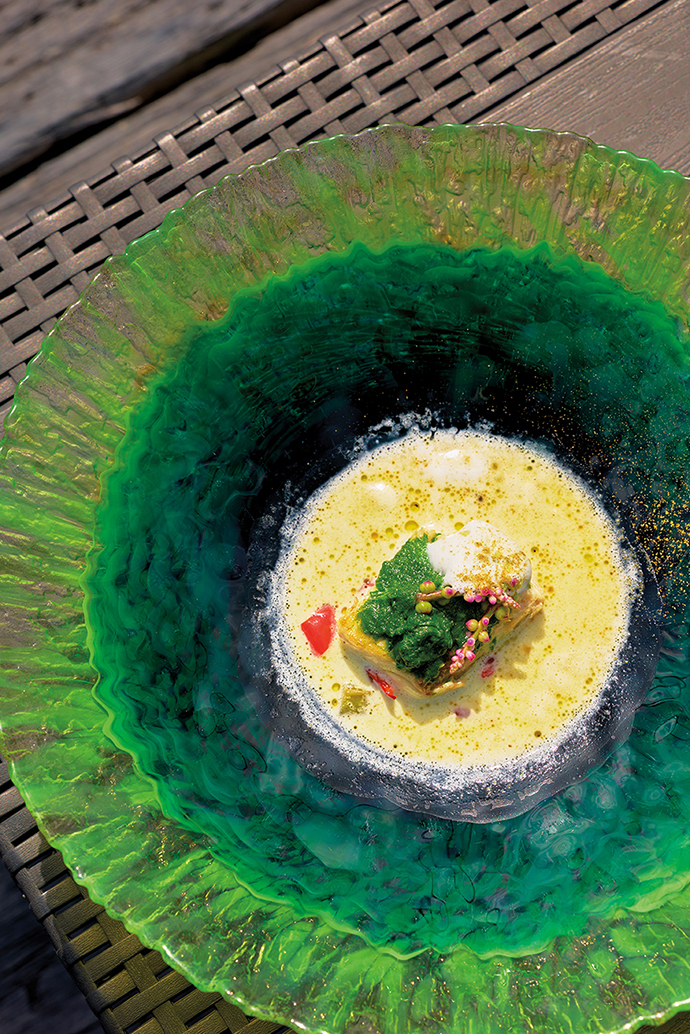 요리를 즐기던 이진곤 셰프가 의아한 듯 말했다. “주방에 간장이 없어요. 오늘 만든 요리에도 간장을 쓰지 않았고요. 아무리 프랜치 레스토랑이라 해도 일본 음식점인데 말이죠.” 빙긋 웃는 후쿠오카 준 셰프의 답변은 놀라웠다. “요리에 절대 간장을 쓰지 않아요. 간장을 싫어하는 게 아니라 오히려 그 반대죠. 간장은 완벽한 조미료인 동시에 재료 본연의 맛을 덮어요. 마늘도 마찬가지죠. 어종에 따라 천차만별인 생선의 풍미를 최대한 살리려면 간장과 마늘을 포기해야 했어요. 버터나 크림을 거의 쓰지 않고, 오일과 채소 페이스트로 소스를 만드는 것도 같은 맥락입니다.”