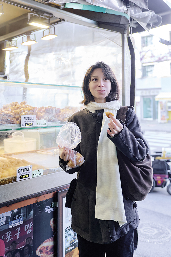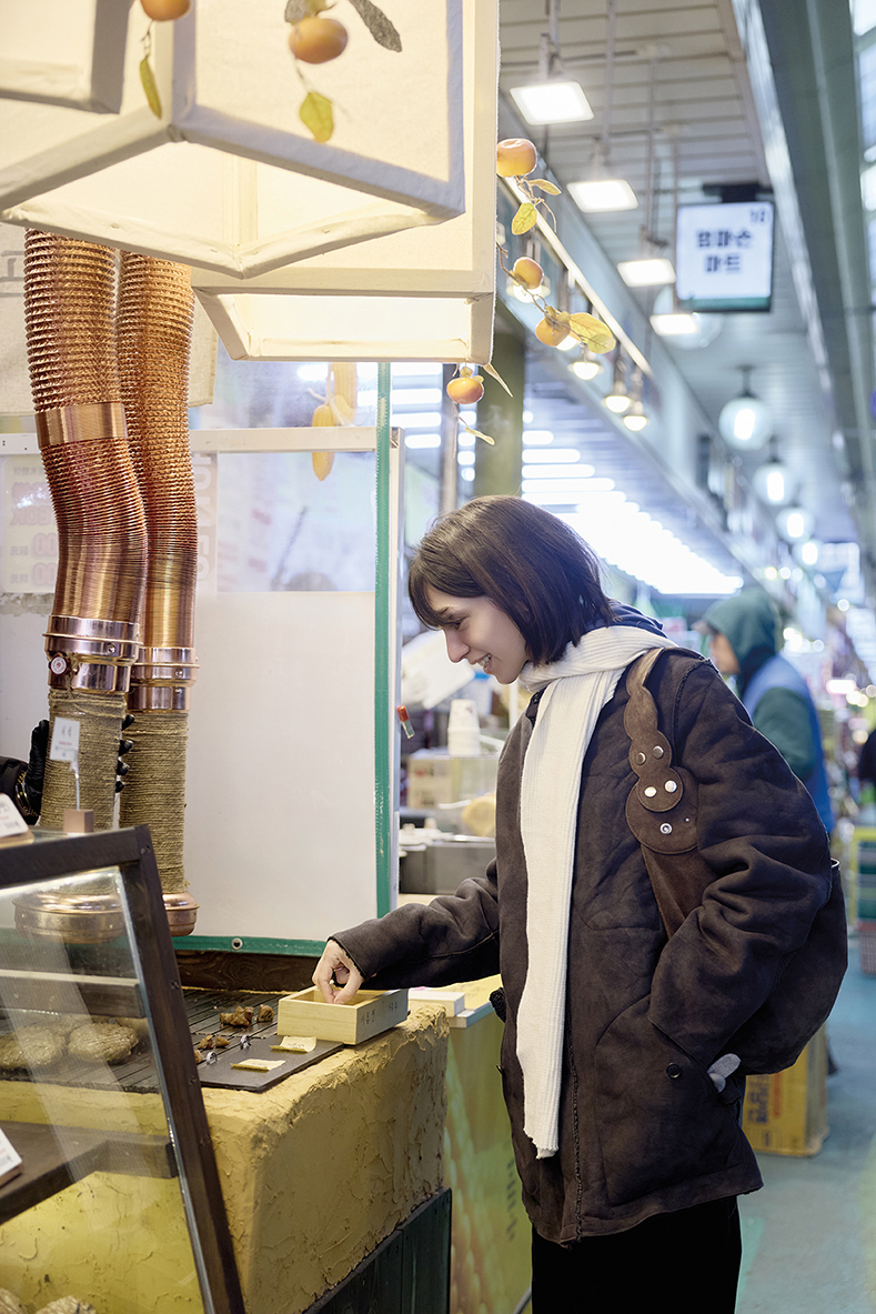 본격적인 망원동 투어의 시작은 망원동의 랜드마크이자 미식의 성지인 망원시장이다. 주말이면 맛집 탐방에 나선 젊은 관광객과 장을 보러 나온 주민들이 뒤섞여 그 자체로 엄청난 에너지를 뿜어낸다. 입구에 들어서자마자 고소한 기름 냄새와 상인들의 활기찬 목소리가 부켓을 반겼다. 부켓이 가장 먼저 찾은 곳은 시장 지하 1층에 위치한 ‘훈훈호떡’. 이미 SNS에서 핫한 이곳에서 그녀는 달콤하고 짭짤한 뿌링클 호떡과 고소한 씨앗 호떡을 한 손에 들고 아이처럼 기뻐했다. 이어 바삭한 튀김옷 속에 부드러운 속이 꽉 찬 크로켓까지 야무지게 베어 물며 달콤한 간식을 만끽했다. 시장을 둘러보던 부켓의 발길이 멈춘 곳은 생선 가게 앞. 겨울철 별미인 양미리가 짚으로 엮여 주렁주렁 매달린 모습을 보고 그녀는 연신 카메라 셔터를 눌렀다. “이 길쭉한 생선은 이름이 뭐예요? 한국 시장에는 정말 신기한 비주얼의 식재료가 많아요. 줄 서서 먹는다는 큐스 닭강정부터 바삭한 크로켓, 그리고 칼국수까지. 1만원짜리 한 장이면 애피타이저부터 디저트까지 해결 가능하네요. 터키의 바자르(시장)랑 비슷하면서도 다양한 길거리 음식을 저렴하게 즐길 수 있다는 점이 너무 매력적이에요.”