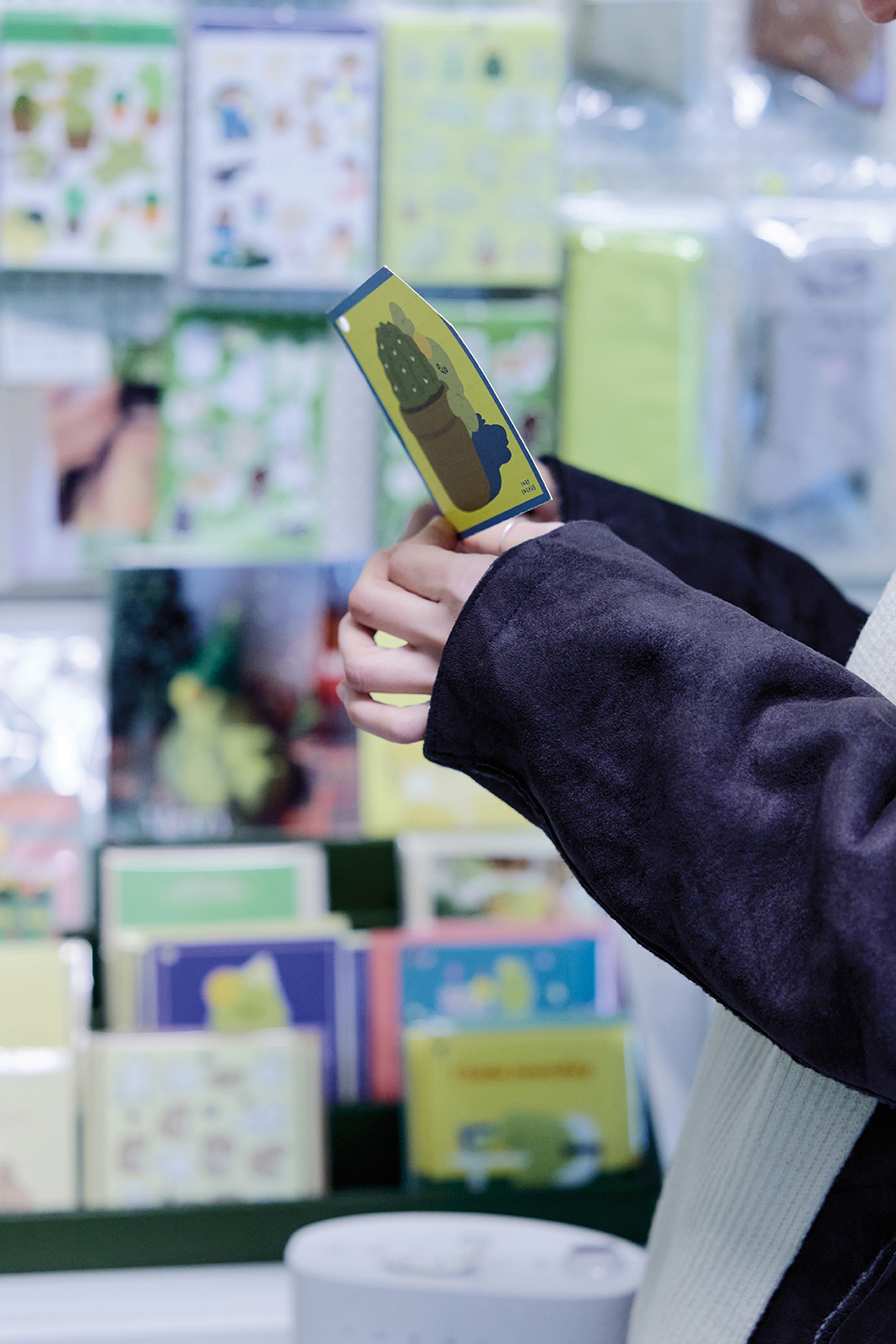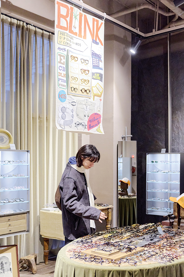 빈티지 숍에서 나와 몇 걸음 걷다 보면 안경 박물관이 연상되는 압도적 규모의 ‘블링크 안경’을 마주하게 된다. 트렌디한 브랜드가 모여 있는 1층과 빈티지하고 클래식한 럭셔리 라인을 소개하는 지하 1층으로 나뉘어 있어 아이웨어 마니아들의 성지로 불린다. 부켓은 1층에서 투박한 뿔테 안경을 써보며 장난스러운 표정을 짓더니, 지하로 내려가 섬세한 금속 프레임 안경을 착용하고는 사뭇 진지한 표정으로 거울을 보았다. 쇼핑의 마지막 목적지는 귀여운 소품 숍 ‘웅크린 선인장’. 초록색 몸을 웅크리고 있는 무표정한 선인장 캐릭터가 반기는 곳이다. 부켓은 앙증맞은 선인장 키링과 엽서를 한아름 집어 들며 아이처럼 기뻐했다.