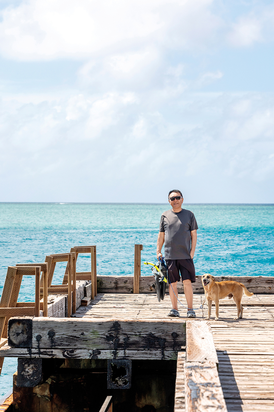 “괌에서 프리다이빙을 처음 시작했어요. 30년 전에 이곳 현지인 친구들을 통해 스피어 피싱을 알게 되면서 맨몸으로 바다를 누비는 다이빙의 세계를 접하게 됐습니다. 작살로 물고기를 잡는 것도 재미있었지만 다채로운 해저 지형을 눈에 담는 것도 즐거웠어요. 결국 사람들에게 괌 바다의 매력을 보여주는 것이 직업이 됐죠. 다이빙을 본격적으로 즐기는 이들은 물고기보다 바닷속 환경을 좀 더 흥미롭게 여깁니다. 제가 살고 있는 괌 남부 코코스 라군(Cocos Lagoon)은 1990년대에 여기에서 제트스키를 타며 놀다 매력을 발견한 곳이에요. 언뜻 바다처럼 보이지만 산호초에 둘러싸인 해안 석호입니다. 리프 바깥, 그러니까 산호초 외곽은 수중 절벽이 있어 수심이 극단적으로 깊어지는 포인트고요. 프린지 리프, 드롭 오프 등 다양한 다이빙 포인트를 만날 수 있는 곳이죠. 그래서 계속 눈여겨보다가 좋은 기회가 와서 코코스 라군에서 해양 액티비티를 즐길 수 있는 비키니 아일랜드 클럽을 열게 됐어요. 코코스 라군 안엔 ‘비키니 아일랜드’가 있는데요. 썰물 때 드러나는 모래톱의 형태가 하늘에서 봤을 때 비키니 수영복처럼 생겨서 제가 붙인 별명입니다. 뭍에서 약 3~4km 떨어진 지점이라 다이빙, 스노클링으로 다양한 어종을 볼 수 있어요. 거북이나 돌고래가 가장 인기가 많죠. 북쪽에 있는 리티디안 비치(Ritidian Beach)도 지인들과 종종 가는 곳인데, 국립야생동물보호구역답게 보존 상태가 꽤 훌륭합니다. 배를 타고 나가지 않아도 해변에서 걸어 나가 리프 다이빙을 즐길 수 있어요. 물이 맑아 시야가 좋고 산호 군락, 거북, 가오리 등 볼거리도 많고요. 단, 갑작스럽게 깊어지는 해안 절벽 지형이 있어서 안전에 유의해야 합니다.”