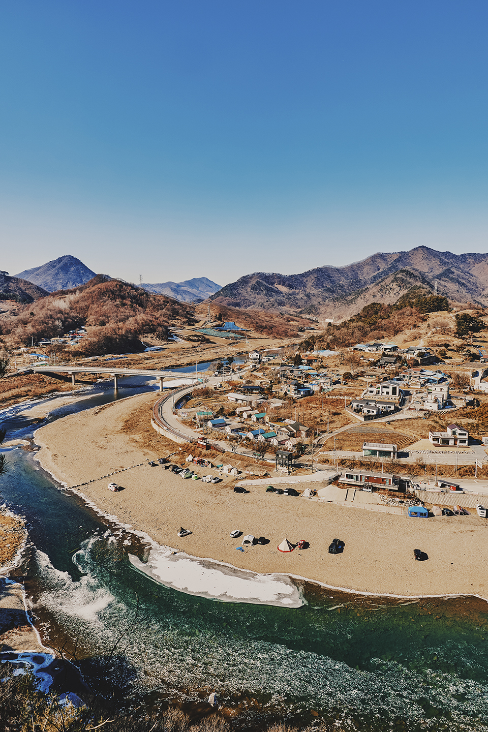 속리산에서 발원해 충주로 흘러오는 달천강은 충주 사람들의 자부심 그 자체다. 조선시대에 “물맛은 충주 달천강이 으뜸”이라는 기록이 있을 정도로 물이 맑고 달기로 유명했다. 수달이 살아 달강(獺江), 물맛이 달아 감천(甘川)이라는 이름도 얻었다. 달천강이 굽어 흐르며 만든 절경 중 제일은 수주팔봉. 살미면과 대소원면 사이에 솟은 이 봉우리는 깎아지른 듯한 바위 절벽과 강물이 어우러져 한 폭의 산수화를 연상시킨다. 특히 강물에 비친 여덟 개의 봉우리가 아름다워 많은 이의 발길을 붙들고 있다. 전망대에 이르는 과정은 제법 고되지만 그 끝에서 마주하는 풍경은 보상처럼 다가온다. 가파른 절벽 사이를 오르내리며 봉우리의 윤곽에 서면, 고요하던 달천이 칼바위를 지나며 쾌활하게 부서지는 물살이 시선을 사로 잡는다. 수주팔봉이 유명해진 건 단지 드라마 <빈센조> 촬영지였기 때문만은 아니다. 바위 절벽을 정면으로 마주하는 팔봉마을의 자갈밭을 캠핑장으로 만들어 누구나 머물 수 있게 내어준 덕분이다. 숲과 절벽 그리고 강물이 휘감아 도는 이 낯선 비경 덕에 캠퍼들의 성지로 자리매김했다. 굳이 텐트를 챙기지 않아도 좋다. 마을 내 마련된 글램핑장에 몸을 뉘면 시시각각 변하는 수주팔봉의 실루엣이 그림처럼 펼쳐진다.