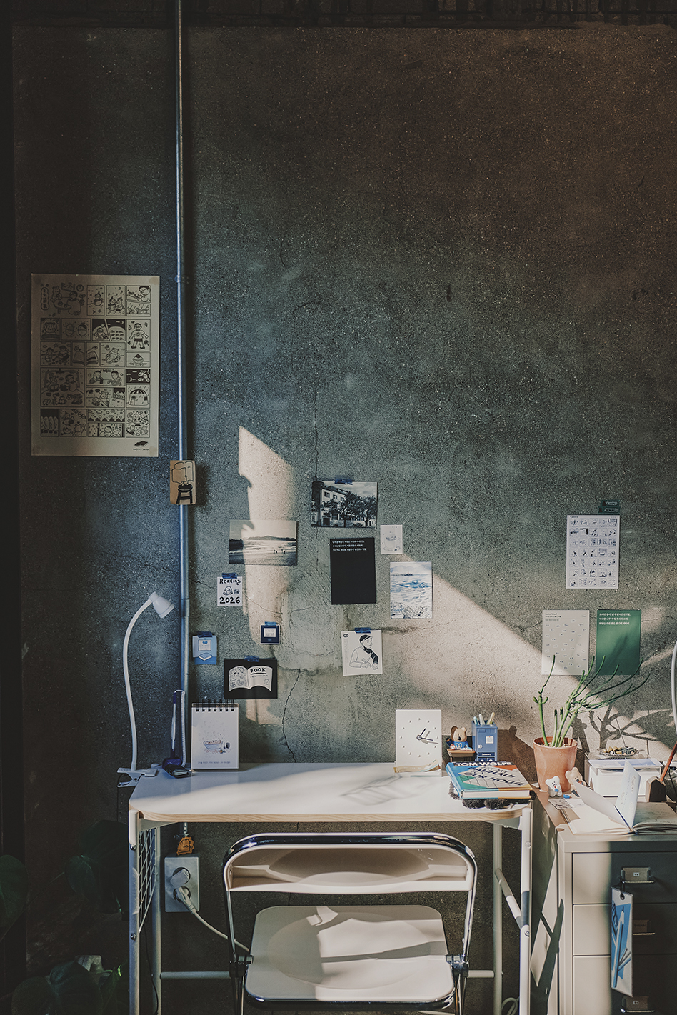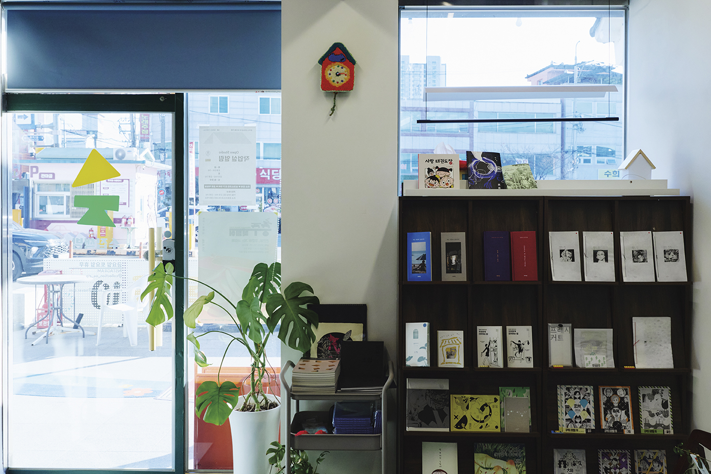 “내 창작물을 전시할 공간이 없다면, 만들면 된다고 생각했어요.” 학업 때문에 충주살이를 시작한 수집책방 대표이자 독립출판 작가 수방방이 남다른 패기로 말한다. 인천 출신인 그는 만화애니메이션학과를 졸업한 후 한적하고 지역 커뮤니티가 잘 형성된 충주에 마음이 동해 이곳에 독립서적만을 위한 책방을 열기로 결심했다. ‘책을 수집하다’는 뜻과 ‘수방방의 집’이라는 중의적 표현으로 이름을 지은 수집책방은 충주 청년몰에 자리하고 있다. 충주시에서 청년 상인들의 성공적인 창업을 위해 저렴한 임대료로 지원하는 청년몰은 창업가나 창작자가 한데 모여 네트워크를 형성하는 곳이다. 6평 남짓한 작은 공간 안에는 바닥부터 천장까지 수방방의 손길이 구석구석 닿아 있다. 이곳에서는 작가가 직접 제작한 출판물을 비롯해 다양한 장르의 아트북을 판매하며 인쇄매체, 그림, 만화를 주제로 한 전시나 판화 노트 만들기, 야간 작업반 같은 워크숍이 열리기도 한다. 수방방 작가는 앞으로도 지역에서 독립출판을 하고 싶은 이들에게 도움을 주거나 함께 프로젝트를 도모할 예정이다.
