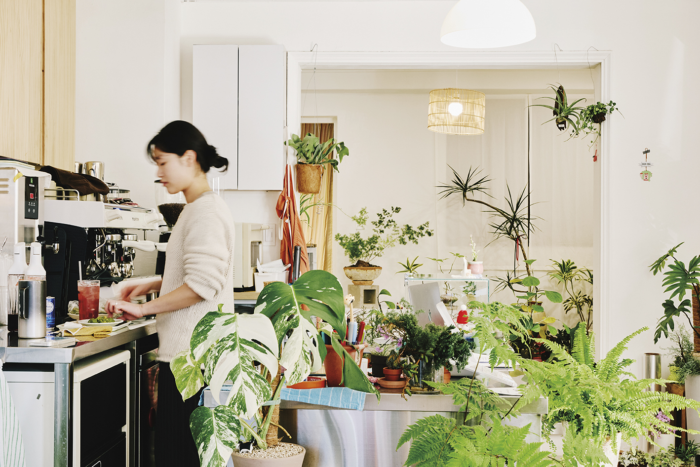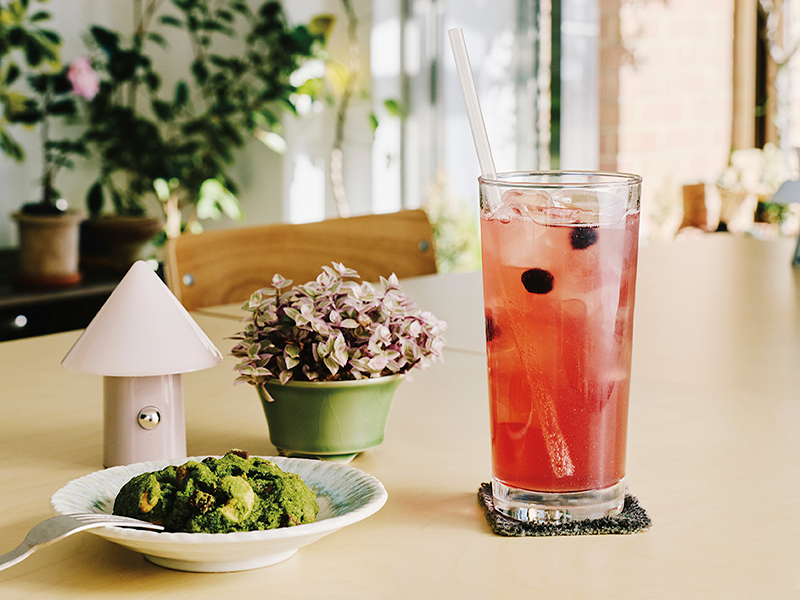 소도시의 매력은 낮고 제각각인 건물이 만드는 정겨운 풍경에 있다. 충주천을 따라 골목 사이를 산책하다 보면, 따뜻한 느낌의 벽돌과 부드러운 곡선 형태의 창문이 어우러진 개성 넘치는 건물을 마주하게 된다. 입구부터 싱그러운 초록빛으로 가득한 이곳은 카페이자 플랜트 숍인 잔풀. 박수빈 대표는 서울에서 직장 생활을 하다 남편의 근무지인 충주로 이주하며 지난해 여름 이곳에 둥지를 틀었다. 잔풀이 들어서기 전 PC방으로 쓰이던 이곳은 통창마다 검은 시트지가 붙어 있어 답답한 모습이었지만 지금은 모든 창을 투명하게 개방한 상태다. 처음엔 식물 가게로만 운영할 생각이었는데, 사람 사이의 온기와 배려가 머무는 공간을 구현해 보고 싶어 카페를 겸하게 됐다. 입구에 낯선 이들이 한데 어우러질 수 있는 커다란 공용 테이블을 두고, 한편으론 혼자만의 시간에 집중할 수 있는 벽 테이블을 배치한 것도 이러한 동경 때문이다. “큰 테이블에 앉아 있으면 모르는 이에게 선뜻 자리를 내어주며 짐을 치우는 모습이 다정하게 느껴졌거든요.” 식물 가게답게 배롱나무 티 에이드, 훈연 유자향 홍차 냉침 밀크티 등 찻잎을 이용한 음료가 대표 메뉴. 공간을 가득 메운 식물과 잔풀의 마스코트 강아지 순돌이를 감상하는 건 덤이다.
