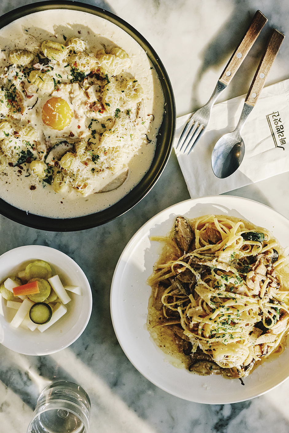 남산에서 발원한 물줄기가 충주 시내를 가로질러 달천강으로 흐른다. 11km 남짓한 충주천 굽이마다 제철 꽃이 피고, 그 곁을 따라 조성된 산책로는 바쁜 일상 속 시민들에게 숨을 고르는 쉼표가 되어준다. 하천의 뒷골목, 나지막한 주택가 사이에 자리 잡은 빠리방앗간은 이름 그대로 프랑스 파리에서 유학하고 고향으로 돌아온 방앗간집 아들 류관열 대표가 운영하는 양식당이다. 8년 전 오픈 당시에는 정통 프랑스 요리에 주력했지만, 당시만 해도 생소했던 현지식 대신 대중에게 친근한 이탤리언 파스타를 중심으로 메뉴를 재구성했다. 류 대표는 익숙한 음식 속에 생소한 식자재를 녹여 새로운 맛을 전한다. 그렇게 탄생한 메뉴가 바로 뇨키크림파스타. 녹진한 크림소스와 감자로 만든 쫀득한 뇨키가 조화를 이루는데, 그 위에 얹은 달걀노른자를 톡 터뜨리면 고소한 풍미가 화룡정점을 찍는다. 리가토니처럼 결이 살아 있는 쇼트 파스타 면을 사용해 다채로운 식감을 선보이는 것도 이곳만의 특징. 업력이 쌓이며 단골 층이 두터워진 요즘은 고정 메뉴의 틀을 유지하면서 ‘오늘의 수프’ 등을 통해 끊임없이 새로운 미식 실험을 이어가고 있다.