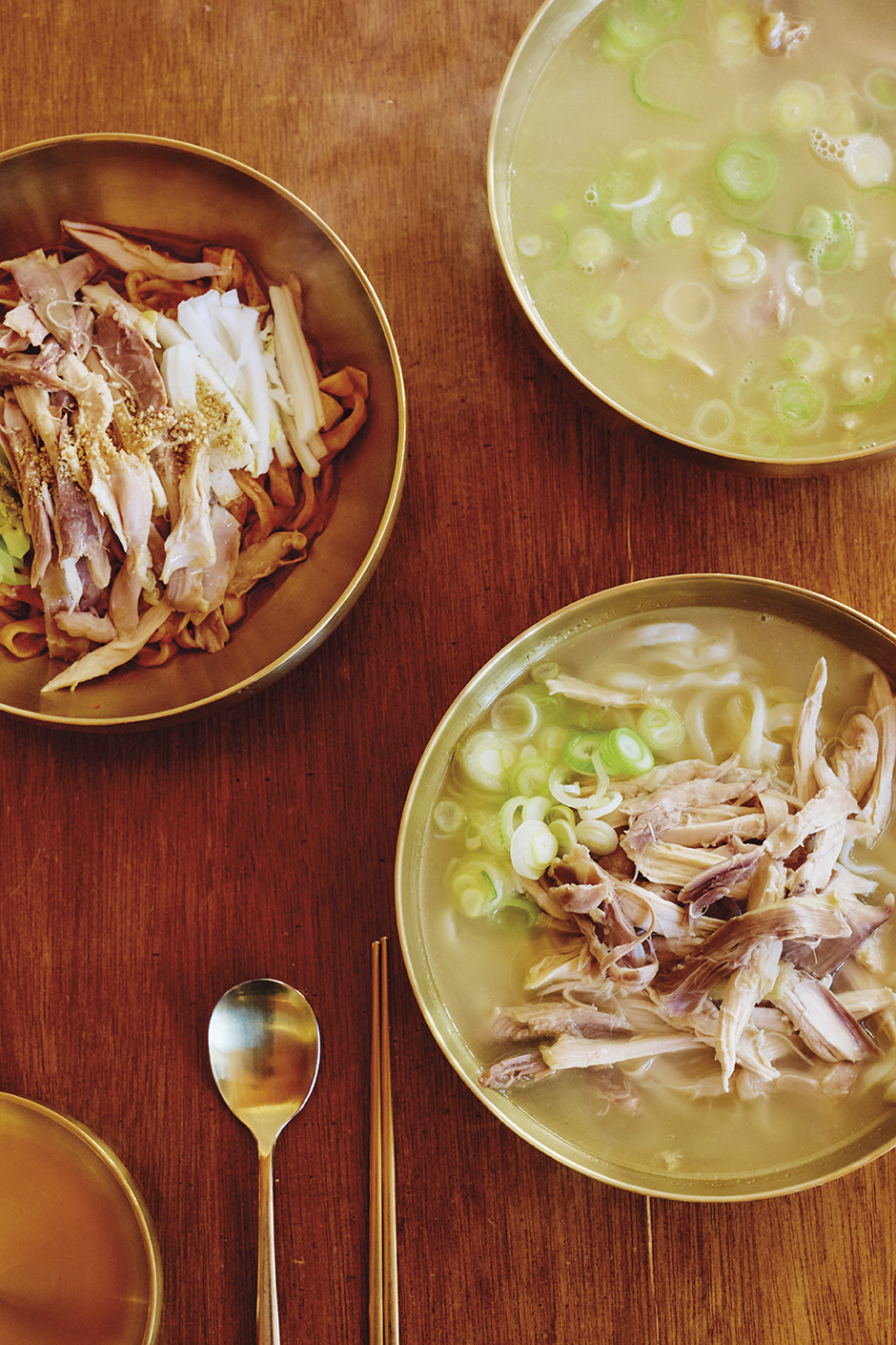 충주를 포함한 내륙지방에서는 음력 6월 15일, 유두(流頭)절을 기념하곤 했다. 모내기가 끝나고 보리와 밀을 거두고 나면 가장 먹거리가 풍성해지는 시기였기 때문이다. 갓 수확한 햇밀로 국수를 만들어 조상에게 제사를 지내고 이웃과 나눠 먹던 풍습이 유두면, 즉 햇밀 칼국수의 유래다. SNS에 충주를 검색하면 칼국수 맛집이 여럿 뜨는 것도 이와 무관하지 않다. 닭곰탕 전문점 진진 역시 이런 지역적 수요와 식문화를 제대로 파악했다. 3년 전, 서울에서 일식집을 운영하다 고향으로 돌아온 이효진 대표는 자신의 소울 푸드인 닭곰탕과 닭칼국수를 대표 메뉴로 내걸었다. 닭곰탕과 닭칼국수를 비롯해 닭매운탕, 닭무침 등 식사는 물론 안주로 즐기기 좋은 요리를 함께 선보인다. 진진의 모든 메뉴가 인기를 끄는 비결은 ‘당일 제작, 당일 소진’을 원칙으로 하는 녹진한 육수에 있다. “어린 닭을 오래 삶으면 실처럼 풀어지죠. 나이 든 닭의 살과 뼈를 오랜 시간 뭉근히 끓여내야만 비로소 깊은 맛이 완성됩니다”라고 이 대표는 설명한다. 뽀얀 국물의 닭곰탕과 닭칼국수는 담백한 맛이 일품이며, 닭비빔칼국수는 쫄깃한 면과 매콤한 양념이 어우러져 감칠맛이 폭발한다.