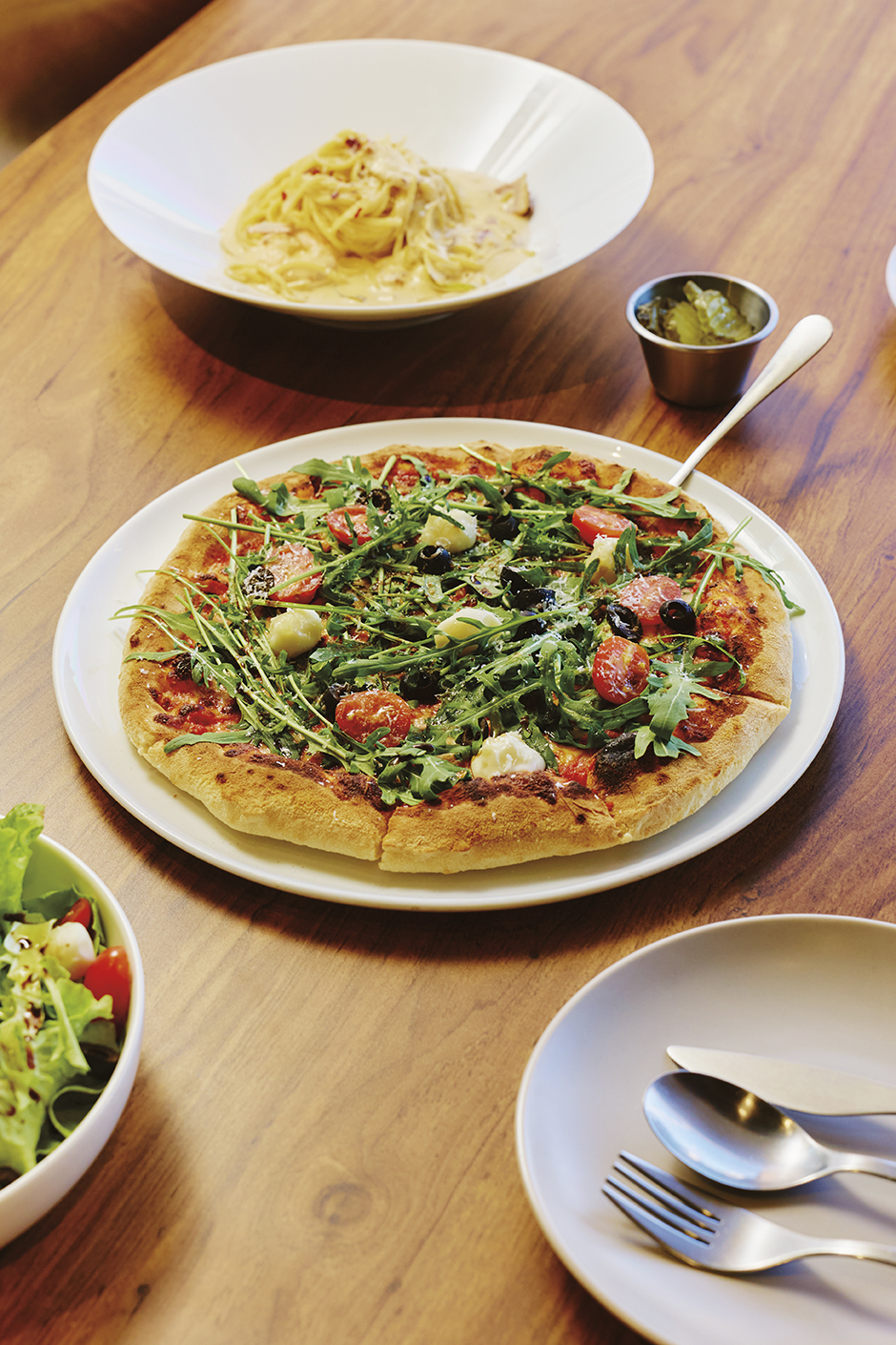 ‘예를 다해 차린 밥상’이라는 뜻을 가진 예반화덕은 그 이름처럼 화덕에 정성껏 구운 피자를 선보이는 곳이다. 옛 염소탕집을 개조해 리모델링한 상가 건물 고티맨숀에 입점해 있다. 옆 건물에 자리한 돈가스 전문점 예반27을 운영하는 김태화 대표가 화덕 피자를 만들고 싶다는 오랜 바람을 이곳에서 실현하고 있다. 오래된 한옥을 이루던 서까래는 공간의 정체성을 상징하는 키포인트. 메뉴 이름에도 이 특징을 고스란히 녹였다. 화덕에서 갓 구운 쫄깃하고 바삭한 도 위에 싱그러운 루콜라와 풍미 가득한 치즈를 올린 피자는 서까래 루콜라가, 짭조름한 프로슈토로 완성한 메뉴는 서까래 프로슈토가 됐다. 피자에 곁들일 수 있는 크림 파스타, 알리오올리오 등의 식사도 준비돼 있다.