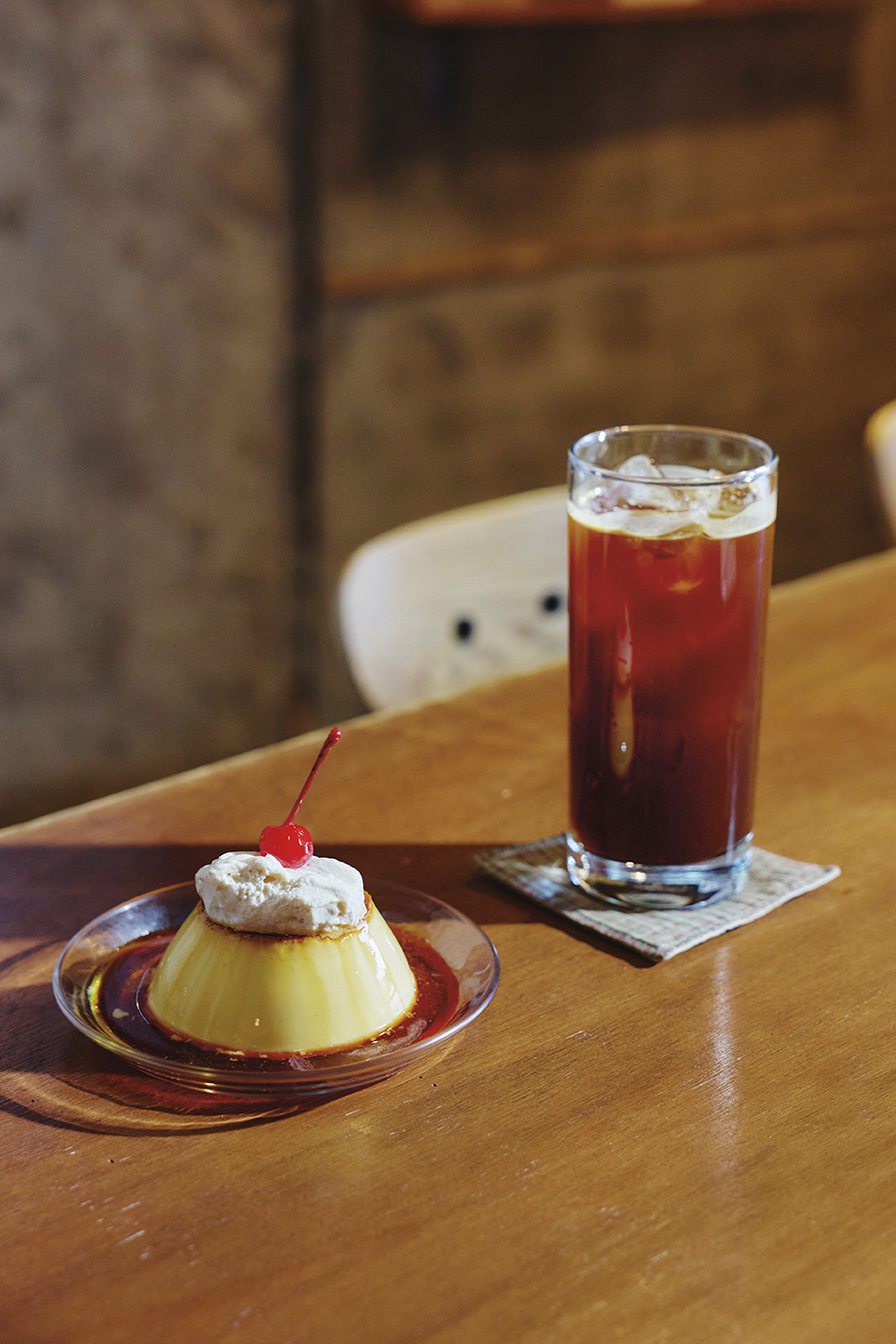 5년 전, 충주에서 자란 두 형제가 1989년에 지은 대림여인숙 건물을 매입해 카페와 게스트하우스를 꾸렸다. 1층 카페 평정은 동생이, 2층 게스트하우스 대림여인숙은 형이 맡아 운영 중이다. 이 프로젝트는 세상상회에서 일하던 동생 이준영 대표의 주도로 진행됐다. 공간 곳곳에 스민 이국적 정취에서 느껴지듯 카페 콘셉트는 여행이다. 시그너처 메뉴를 푸딩으로 정한 이유도 평소 여행지에서나 즐길 수 있는 특별한 디저트라 생각했기 때문이다. 인테리어는 아늑한 우드 톤과 화려한 스테인드글라스를 활용해 일본 소도시의 어느 카페에서 볼 법한 빈티지한 분위기로 채워나갔다. 특히 공을 들인 것은 바 테이블. 손님들과 소통하며 일하고 싶은 마음에 마련한 이 자리에는 흥미로운 이야기가 숨어 있다. 지금의 바 자리는 본래 여인숙 주인이 머물던 방이었고 계산대는 당시에도 손님을 맞이하던 카운터였다. 과거와 현재가 교차하는 지점에서 손님들과 대화를 나누게 된 셈이다. 평정에서는 뜨개 모임, 독서 모임 등 다양한 커뮤니티 행사도 활발히 열린다. 올 상반기에는 카페 앞 건물에 바를 오픈할 예정. 대림여인숙이 그러했듯 평정은 더 많은 사람이 모여 저마다의 이야기를 나누는 공간으로 거듭나고 있다.