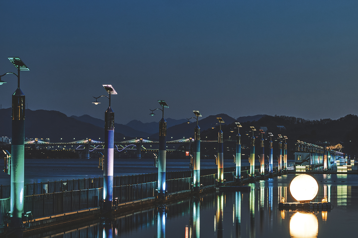 충주 사람이라면 누구나 추억이 깃들어 있는 장소. 충주댐에서 흘러든 물줄기로 형성된 탄금호를 따라 조성된 이 공원은 학생들의 소풍지이자 가족의 나들이 장소, 주민들의 산책로로 현지인의 일상을 오랜 기간 묵묵히 지켜왔다. 여름이면 호수 위에서 수상스키 같은 레저 스포츠를 즐기는 이들로 활기를 띤다. 이 공원의 중심에는 이름에서도 알 수 있듯이 통일신라 때 세운 중앙탑이 있다. 남북 끝에서 동시에 출발한 사람들이 딱 마주친 자리가 이곳이라는 설화가 전해진다. 14.5m 높이의 석탑은 웅장하면서도 치우침 없이 안정적인 자태를 뽐내며 위풍당당하게 서 있다. 2013년 세계조정선수권 대회를 거치며 이곳은 커다란 변화를 맞았다. 국제조정경기장이 들어서고 산책로가 정비되면서 지금의 모습을 갖추게 된 것이다. 드라마 <사랑의 불시착> <빈센조> 등의 촬영지로 이름이 알려진 것도 이때부터다. 탄금호 수면 위로 조명이 내려앉는 일몰 무렵은 이곳이 가장 빛나는 시간이다. 화려한 빛을 머금은 다리들의 그림자가 물결에 일렁이면 낮과는 전혀 다른 밤 풍경이 시작된다.