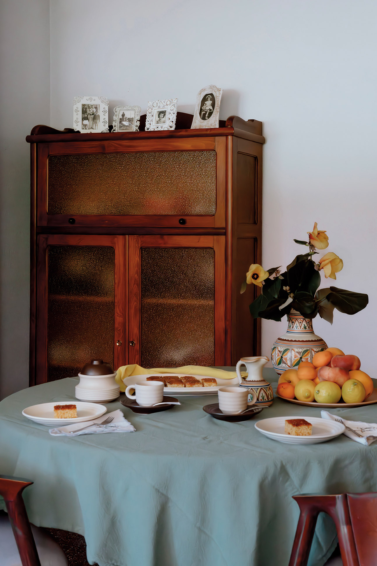 4 마루하에게 물려받은 그릇장, 마리 토니가 혼수로 마련한 그릇, 시어머니의 레시피로 만든 코카 데 얀다로 완성한 따뜻한 테이블.