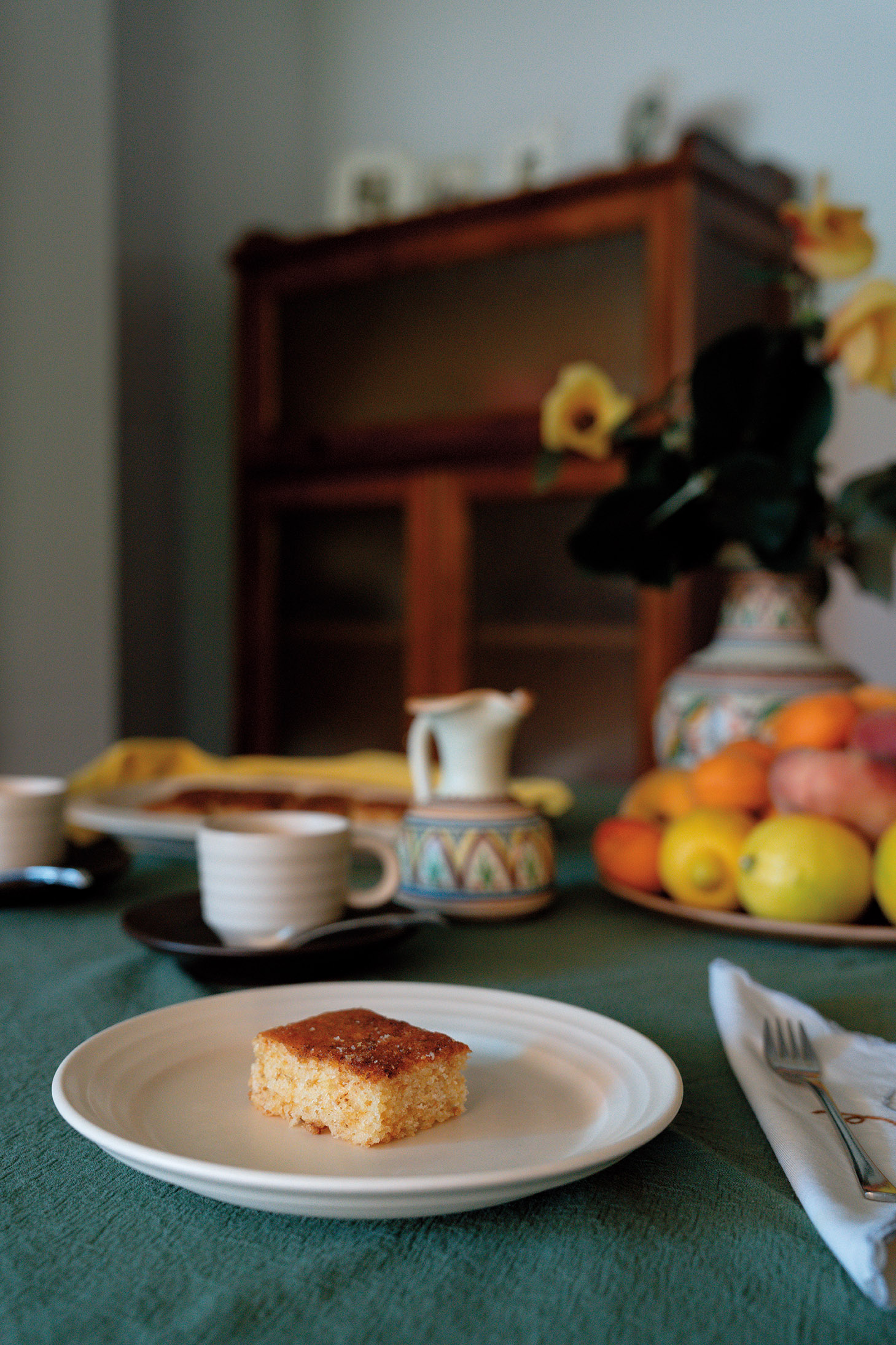 레몬 향이 짙게 배어 나오는 코카 데 얀다(coca de llanda)는 마루하가 종종 만들어줬던 디저트 중 가장 쉽게 따라 할 수 있어 더 자주 만들어 먹은 음식. 발렌시아어로 코카는 케이크, 얀다는 빵을 넣어 굽는 네모난 금속 틀을 뜻한다. 마리 토니는 능숙한 손놀림으로 레몬 껍질을 강판에 갈기 시작했다. 요거트 컵으로 대충 계량한 밀가루 위에 달걀, 설탕을 넣고 고루 섞은 후 반죽을 네모반듯한 틀에 부어 그 위에 계핏가루와 설탕을 뿌린 다음 오븐에 넣으면 준비 끝. 빵이 고소하게 구워지는 동안 거실로 나와 테이블 세팅을 시작했다. 반들반들 윤이 나는 그릇장은 자수를 곱게 새긴 냅킨, 테이블보와 온갖 그릇이 가득한 마리 토니의 보물 창고다. 그중 매끈하고 묵직한 갈색과 상아색 식기를 꺼내며 그가 추억에 잠긴다. “이 그릇장 역시 마루하에게 물려받은 거예요. 여기 보이는 그릇, 찻잔 세트는 제가 혼수로 마련한 거고요.” 오랜 세월과 따뜻한 기억을 품은 기물들을 만지는 그의 얼굴에 행복한 미소가 번진다. 설탕과 계피의 달콤한 향이 공기를 타고 집 안 구석구석 퍼져나갔다. 시장에서 사 온 잘 익은 과일, 겉면에 윤기가 자르르 흐르는 코카 데 얀다를 접시 위에 곱게 담고 리넨 냅킨을 옆에 두니 제법 근사한 식탁이 완성됐다. “발렌시아에서는 식후 증류수에 브랜디와 와인을 섞어 만든 전통주 미스텔라(Mistela)를 즐겨 마셔요.” 마리 토니가 잔을 건네며 달큰하고 톡 쏘는 술을 권한다. 상큼한 레몬 껍질을 소복하게 뿌린 발렌시아식 스펀지케이크를 한 조각 베어 입안에 넣었다. 맛이 어떤지 궁금한 눈초리를 보내는 그에게 이렇게 답했다. “한 조각이 혀 위에서 채 사라지기 전에 다음 조각이 생각나게 하는 맛이에요.”